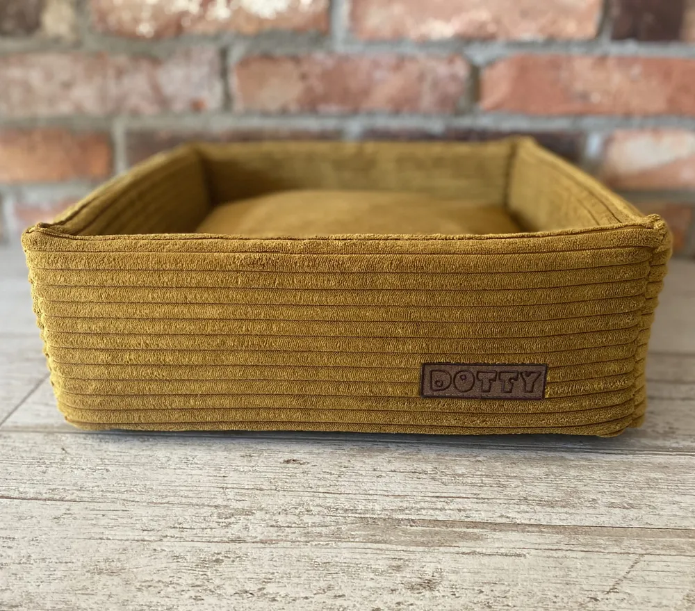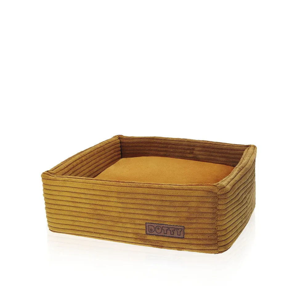 CUBE kwadratowe legowisko dla psa DOTTY - kolor musztardowy sztruks – wysokiej jakości legowisko dla psa, komfortowe i trwałe. Idealne do codziennego odpoczynku, łatwe w utrzymaniu czystości.