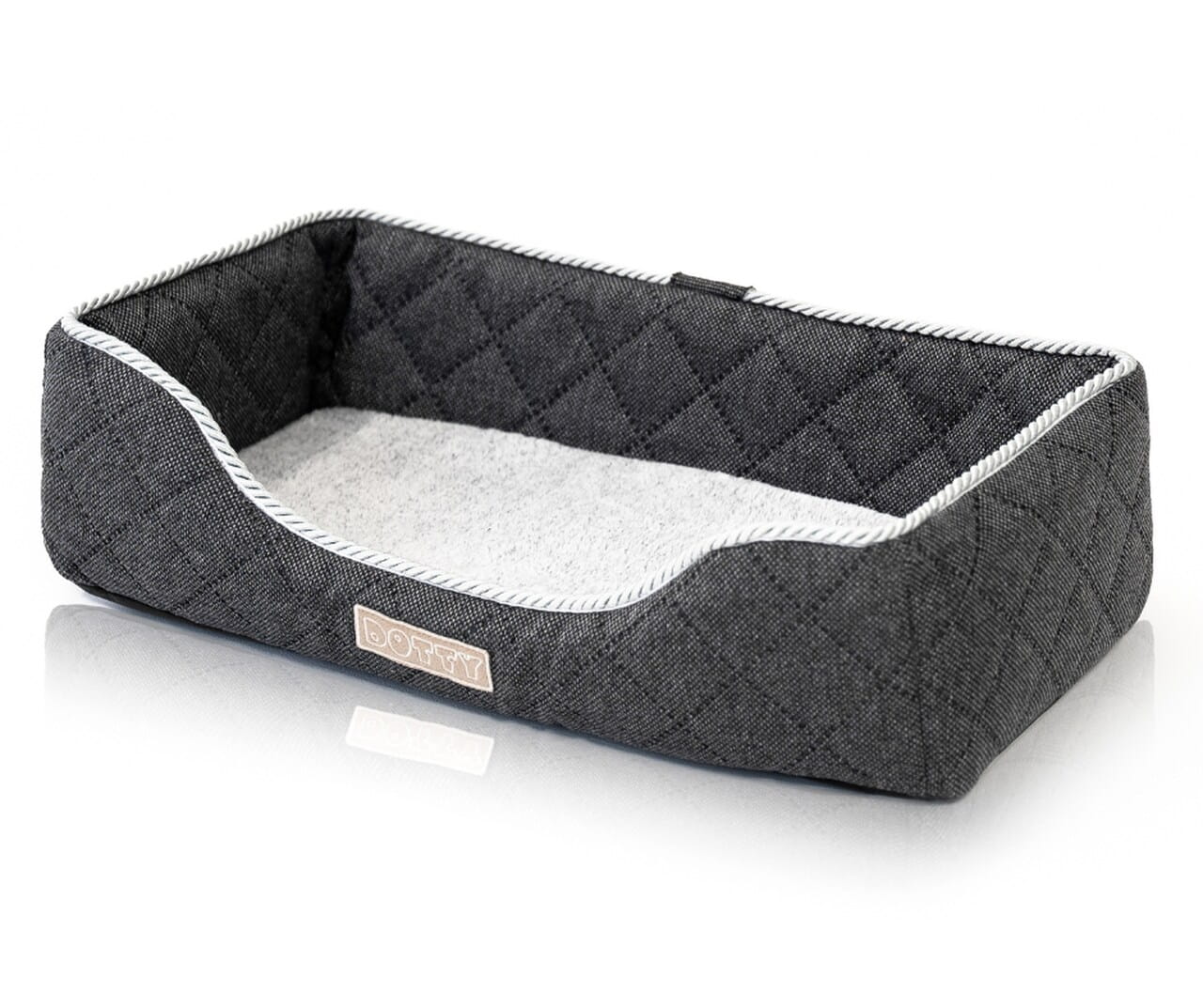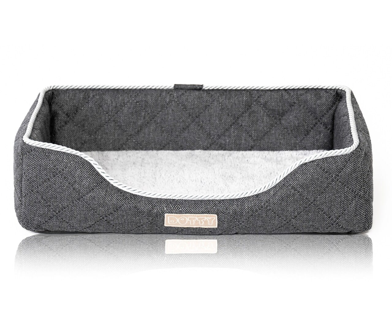 - W legowisku zastosowaliśmy mocną tkaninę pikowaną z ozdobnym połyskującym sznurem