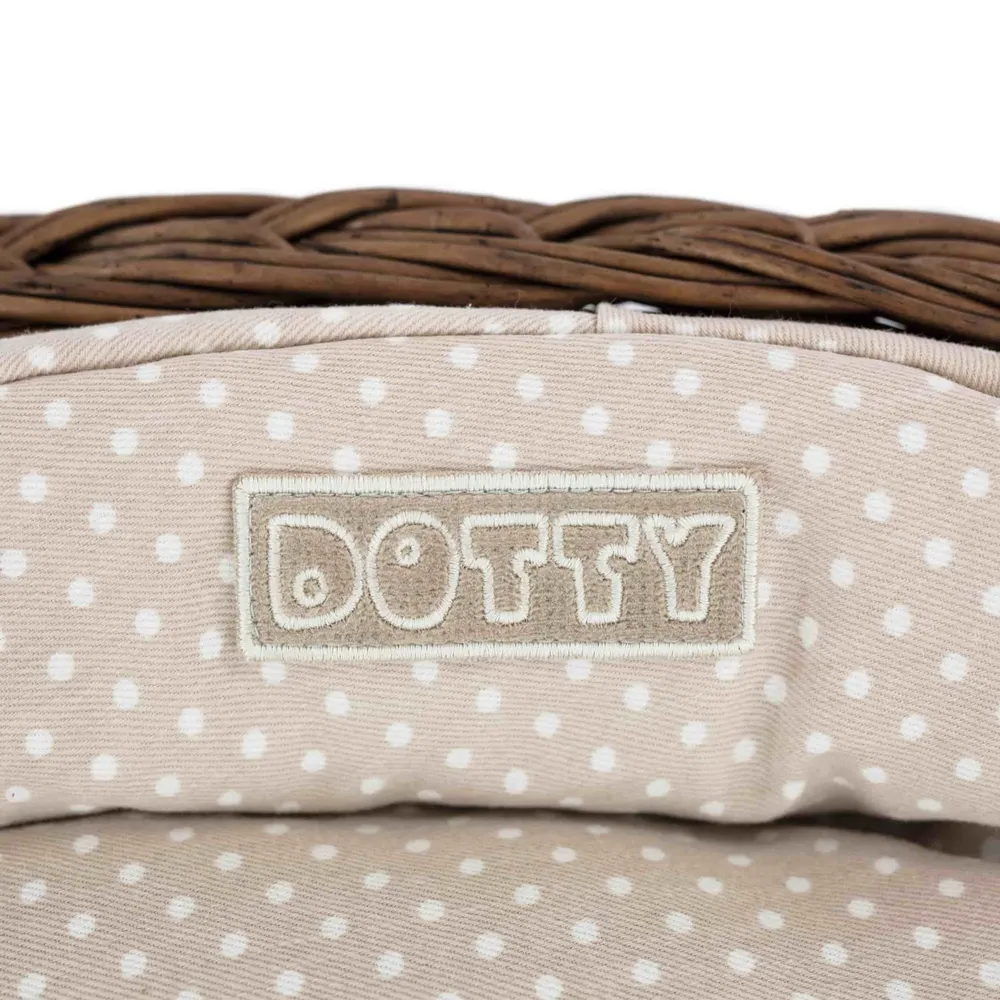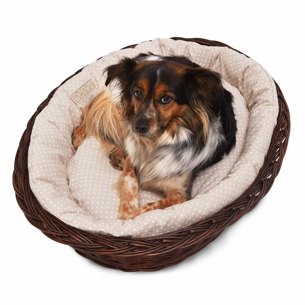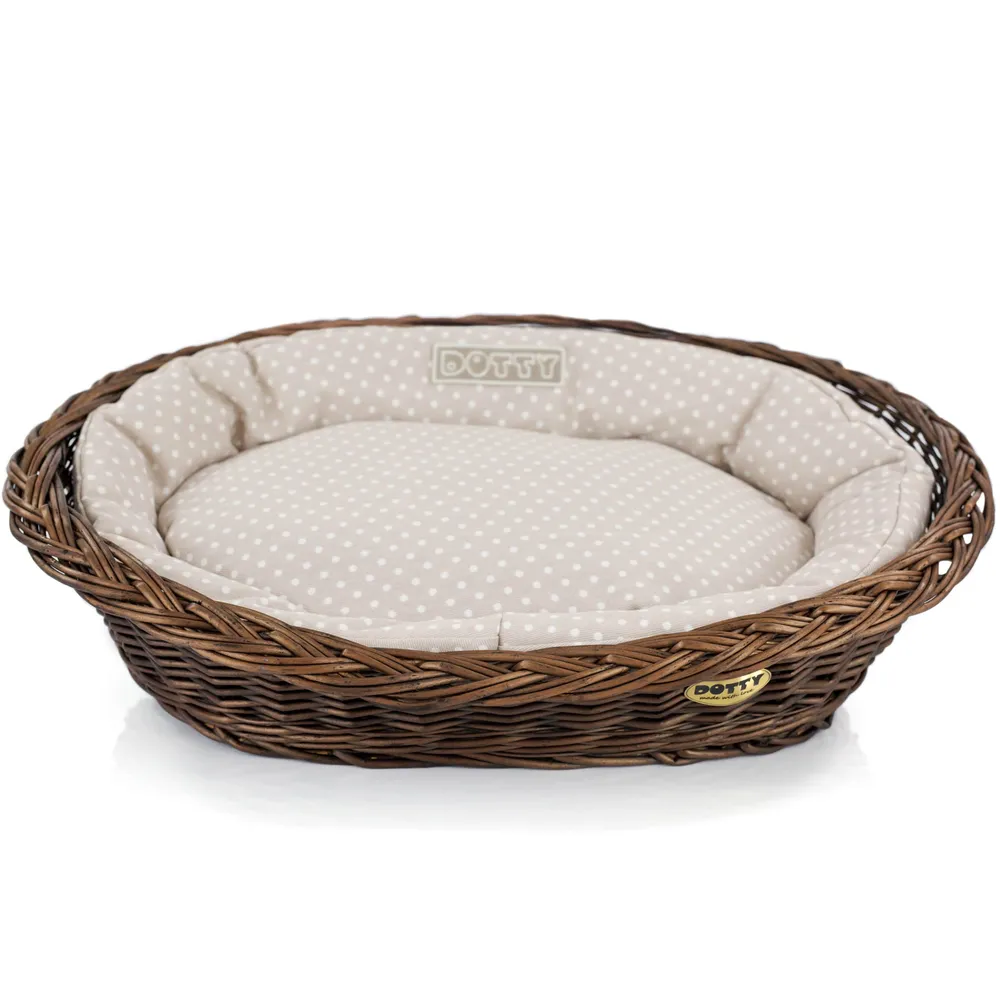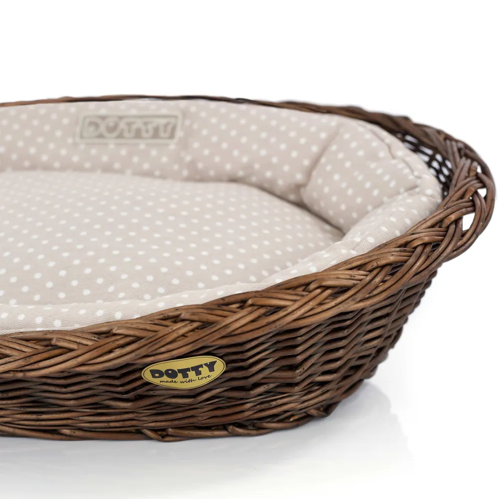 Legowisko / koszyk brązowy / beżowy w białe groszki – wysokiej jakości legowisko dla psa, komfortowe i trwałe. Idealne do codziennego odpoczynku, łatwe w utrzymaniu czystości.