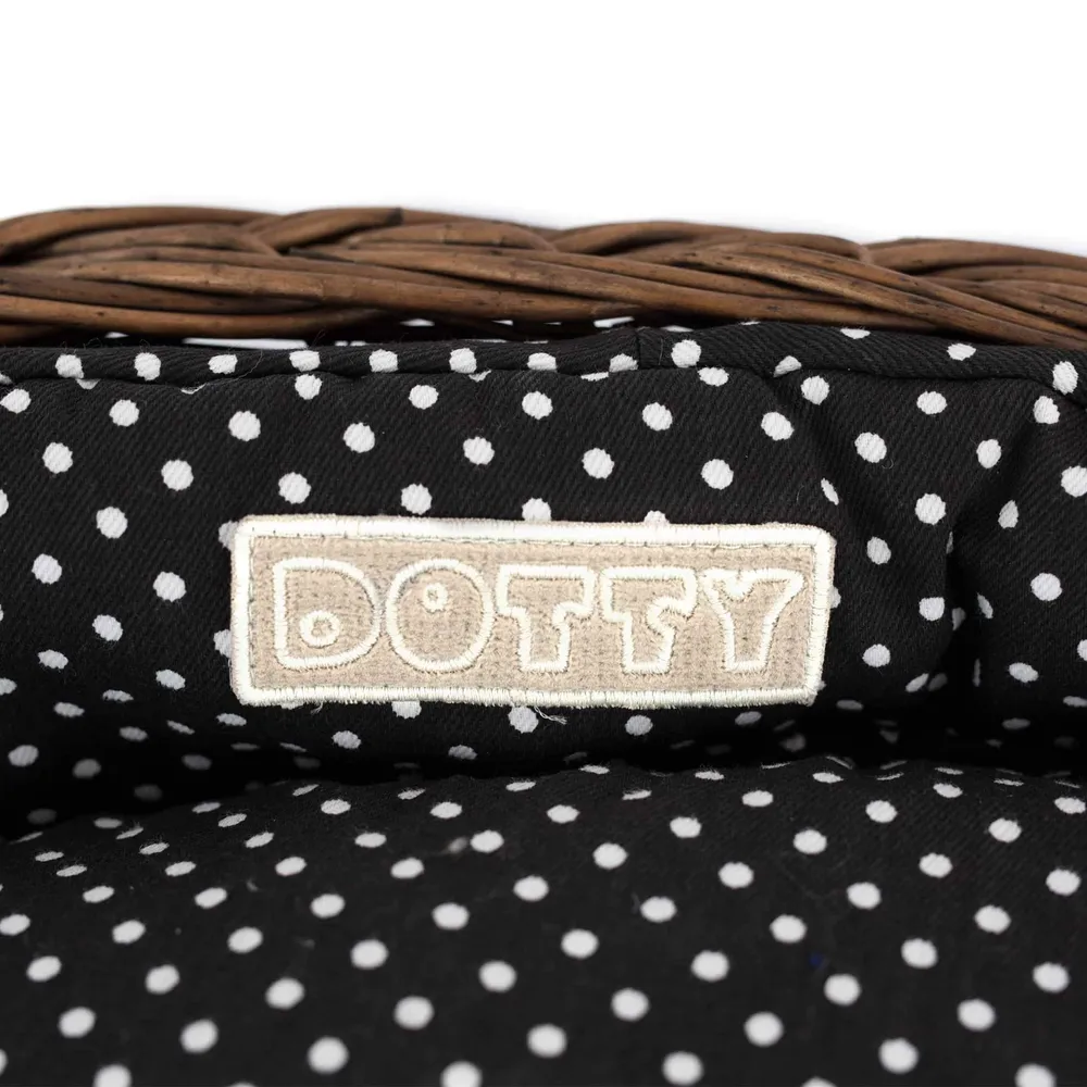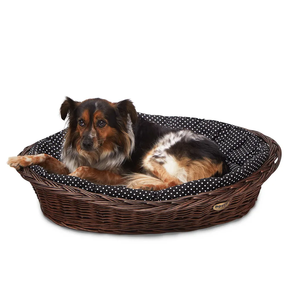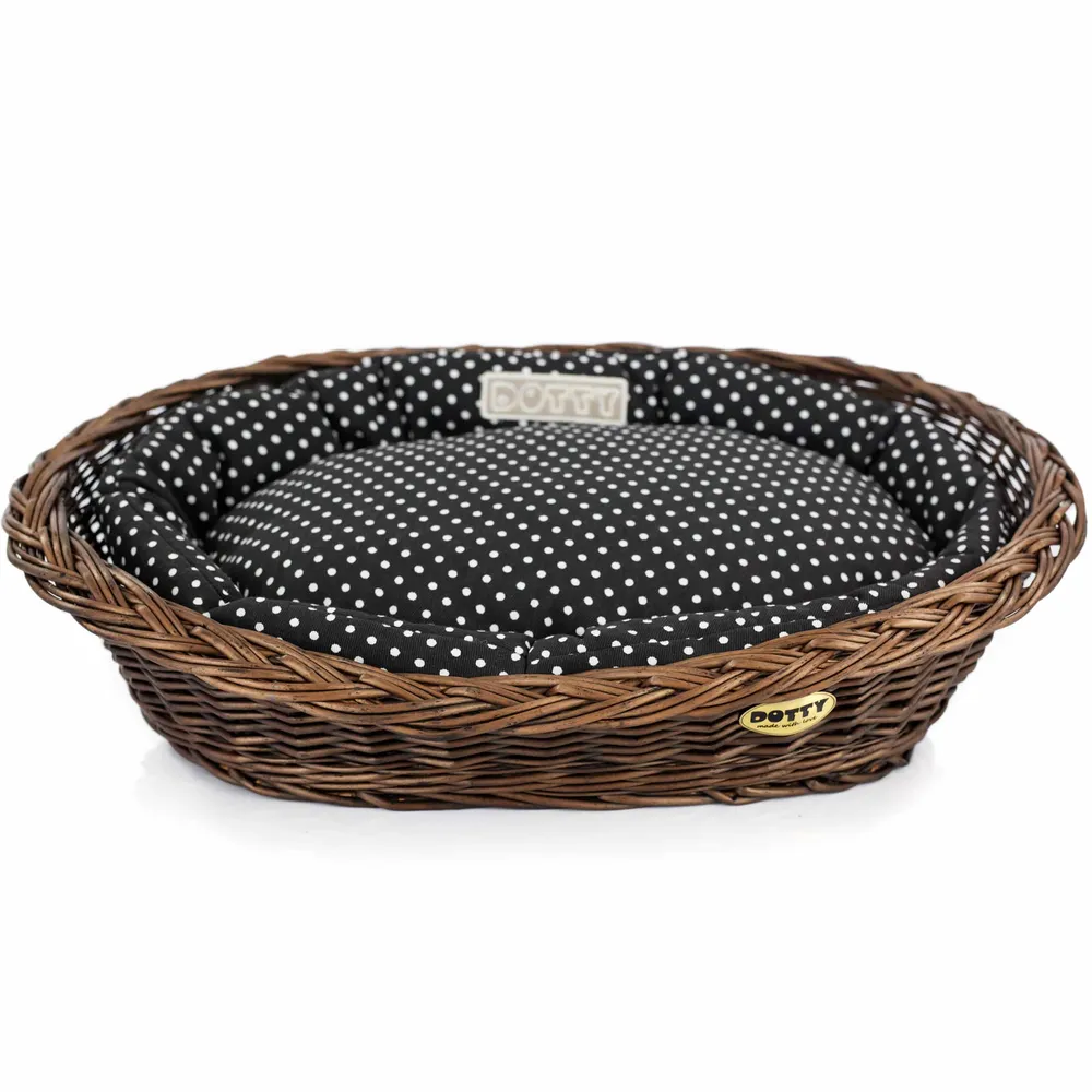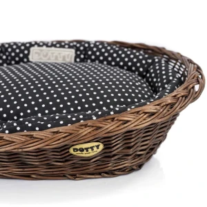 Legowisko / koszyk brązowy / czarny w białe groszki – wysokiej jakości legowisko dla psa, komfortowe i trwałe. Idealne do codziennego odpoczynku, łatwe w utrzymaniu czystości.