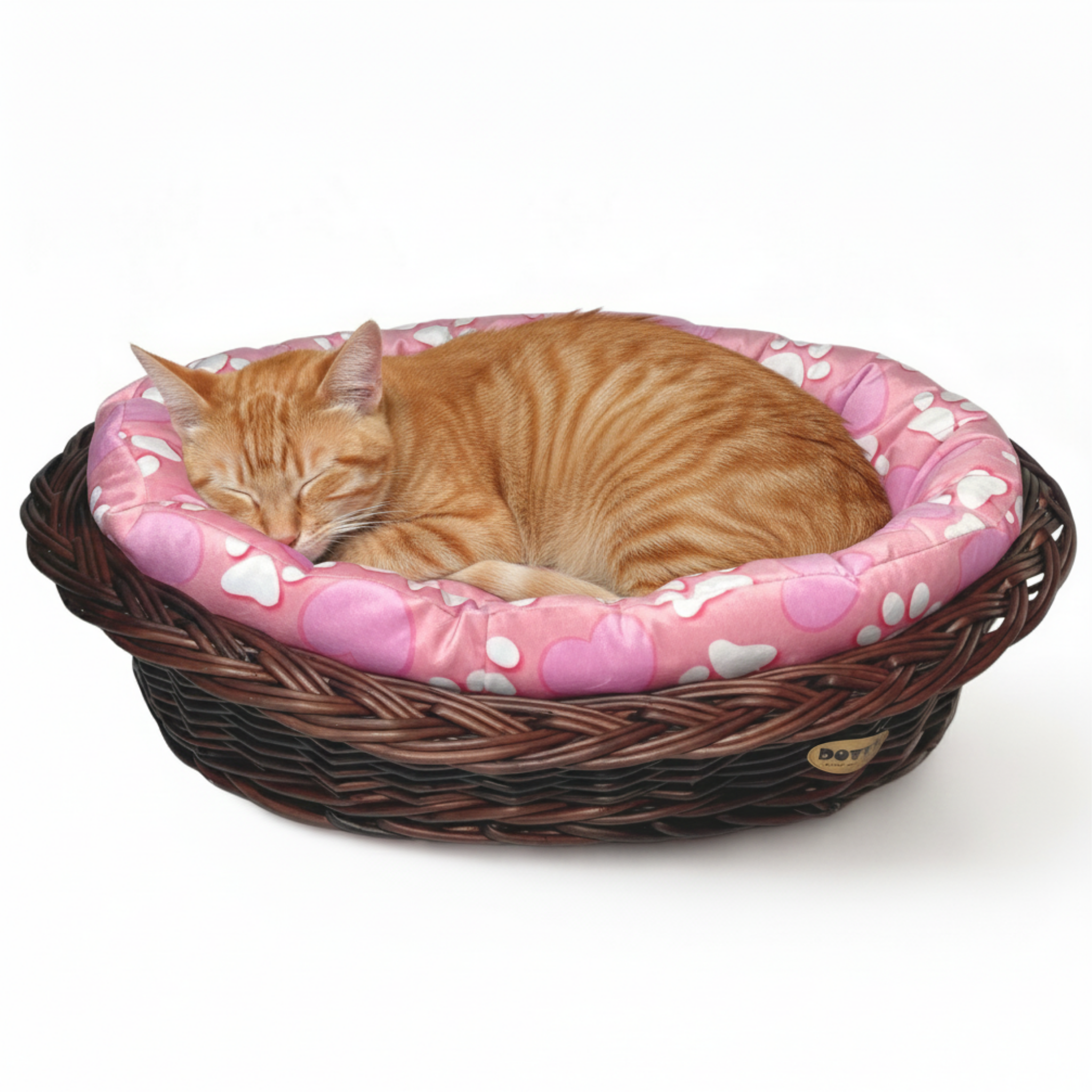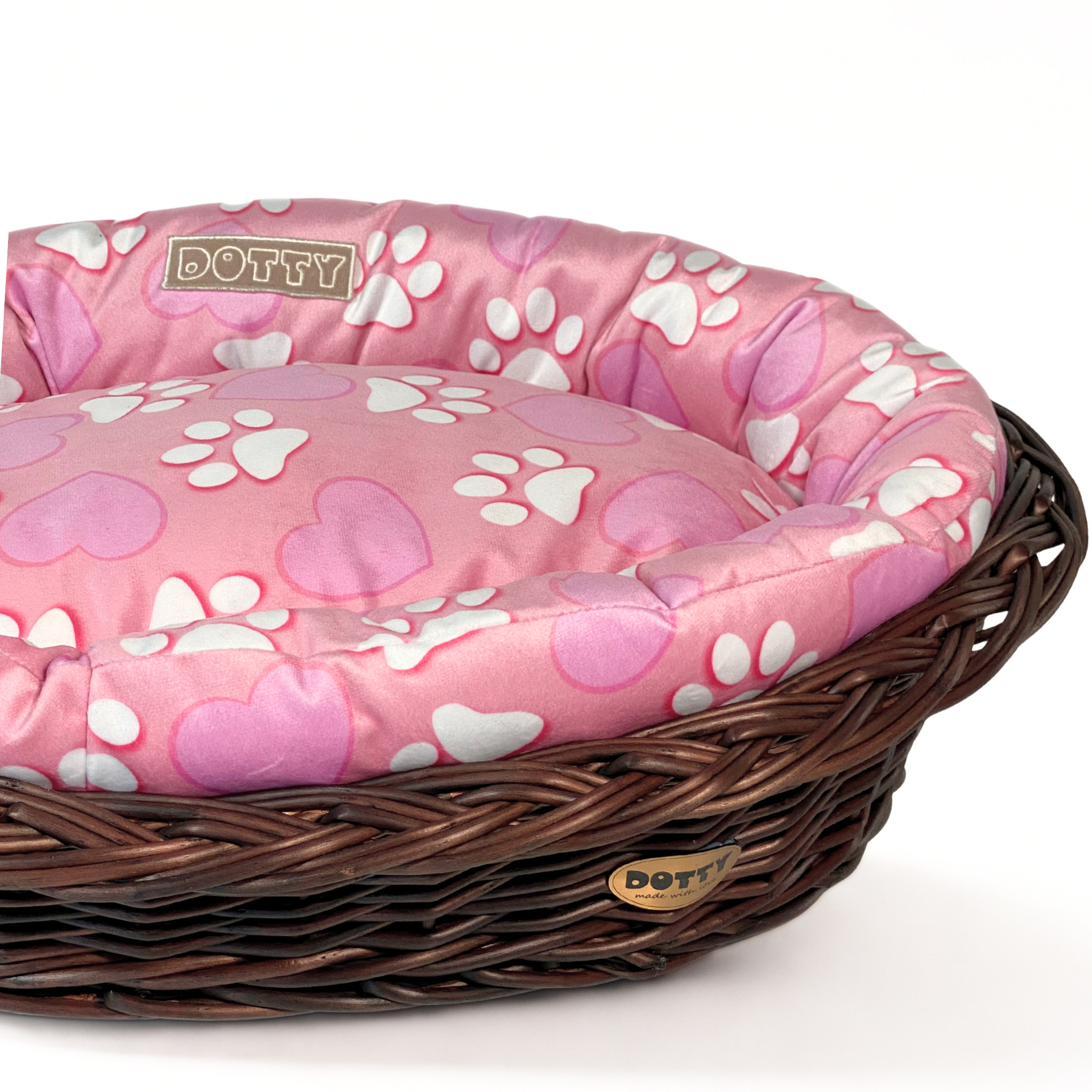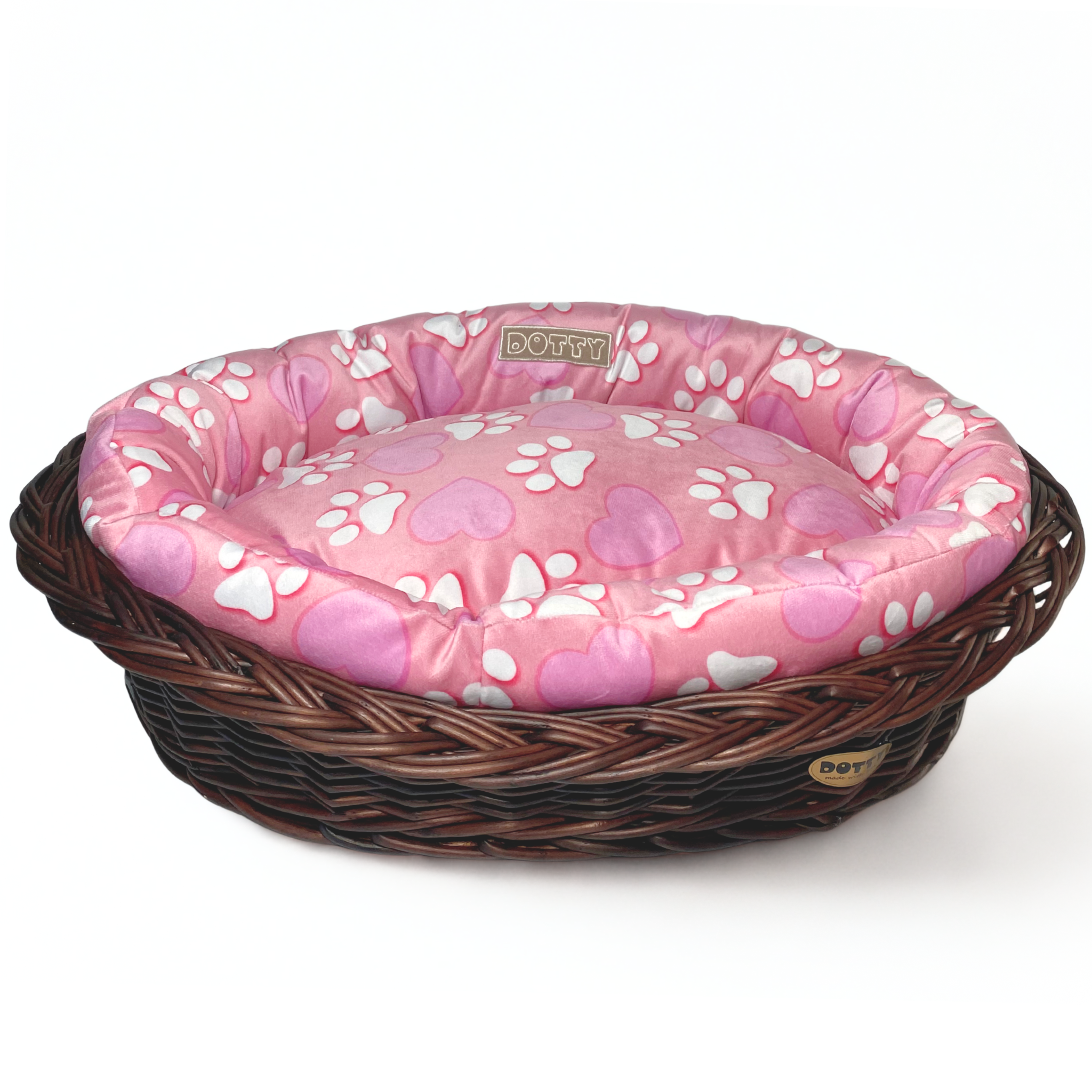 Legowisko składa się z koszyka wiklinowego brązowego i różowych poduszek z wzorem serduszek i łapek