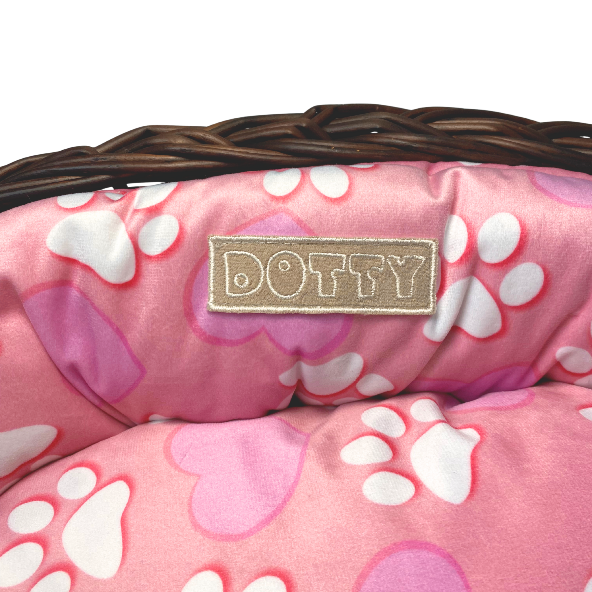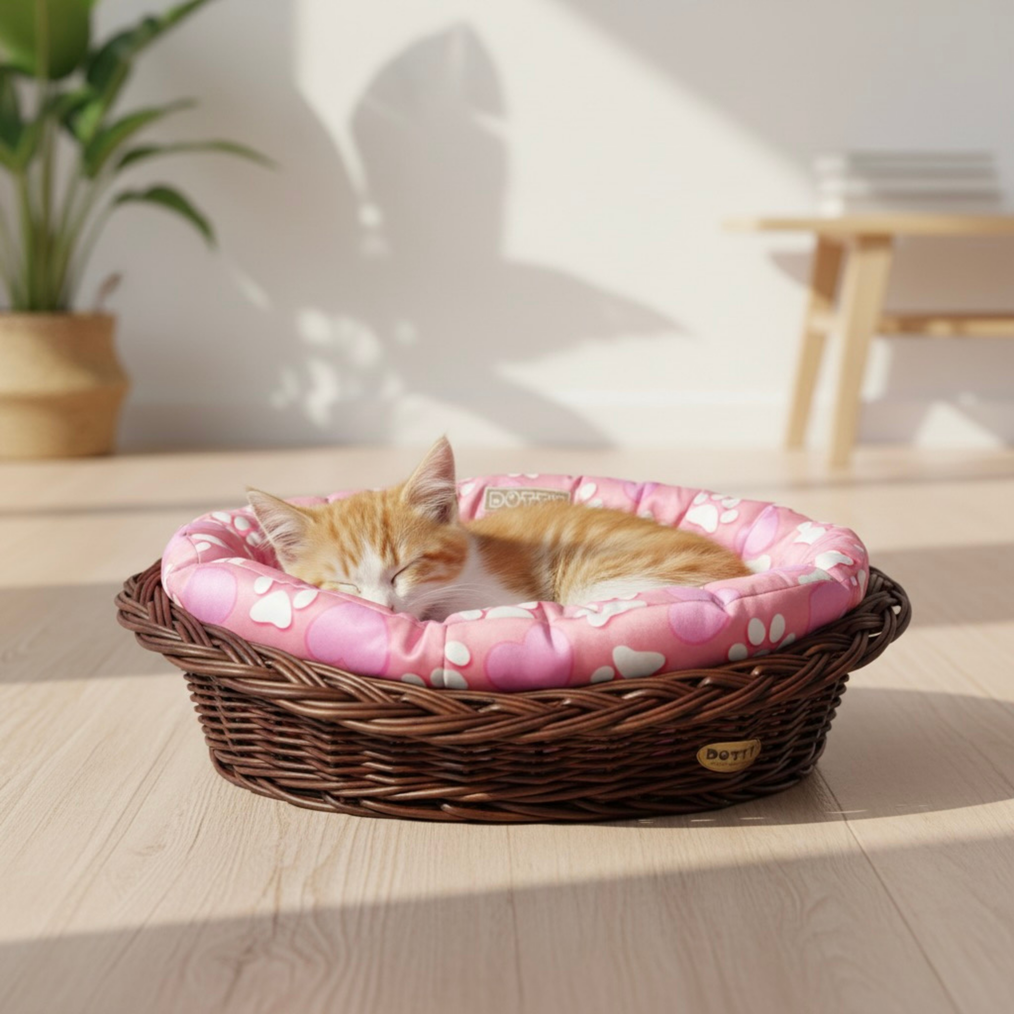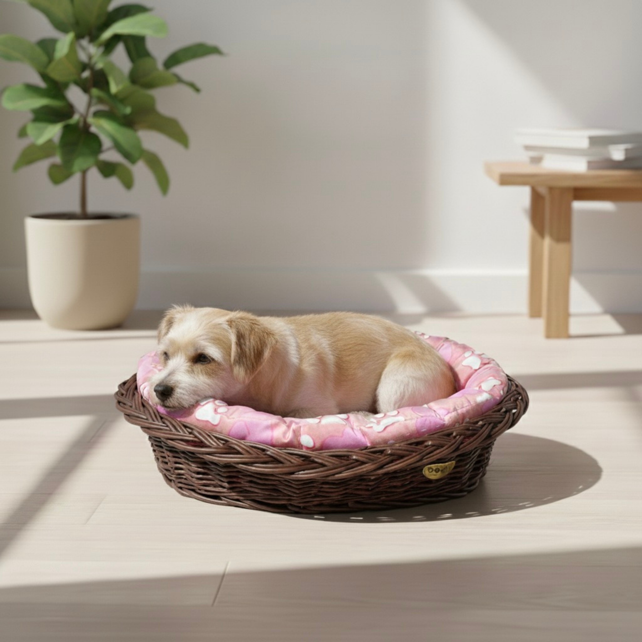 Legowisko składa się z koszyka wiklinowego brązowego i różowych poduszek z wzorem serduszek i łapek