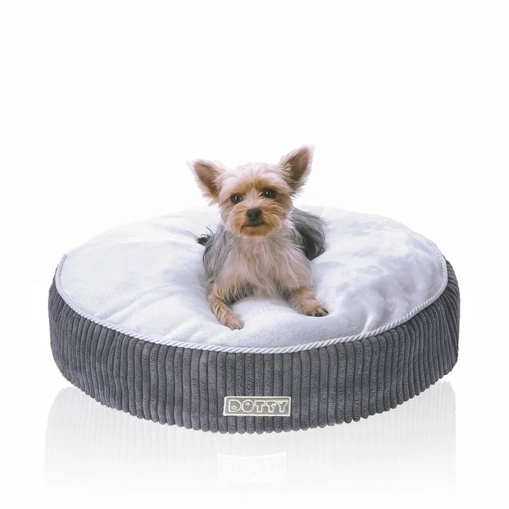 Legowisko poducha - miękka okrągła pufa - grafitowy sztruks z szarym polarem minky – wysokiej jakości legowisko dla psa, komfortowe i trwałe. Idealne do codziennego odpoczynku, łatwe w utrzymaniu czystości.