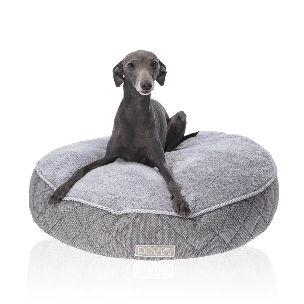 Legowisko poducha - miękka okrągła pufa - szary pikowany z szarym polarem minky – wysokiej jakości legowisko dla psa, komfortowe i trwałe. Idealne do codziennego odpoczynku, łatwe w utrzymaniu czystości.